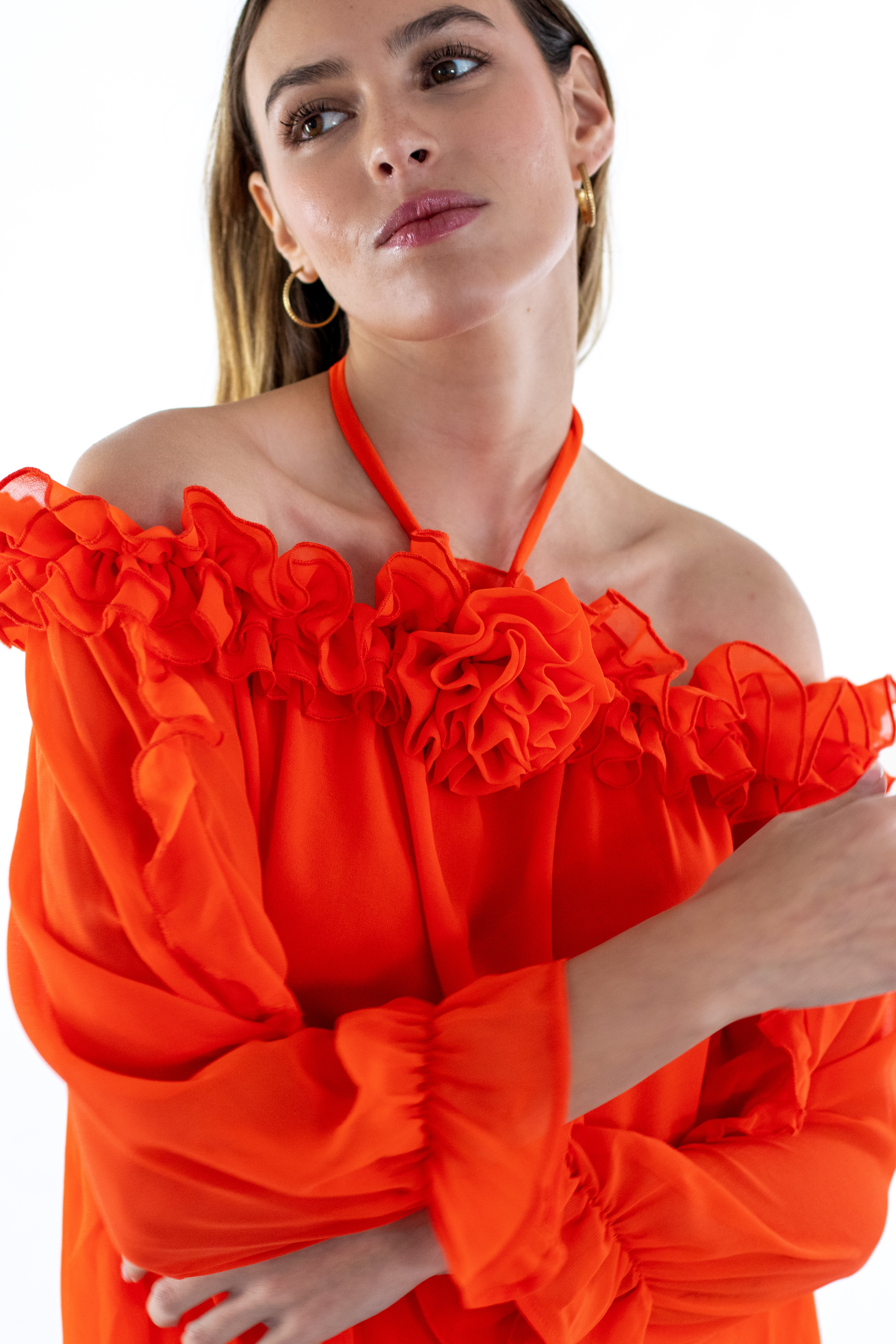 Blusa Flor confeccionada en tejido de poliéster con caída y muy ligero, con doble volante en todo el escote, hombros al aire, y acabada en un volante en la manga. Aplique floral desmontable en el mismo tejido.