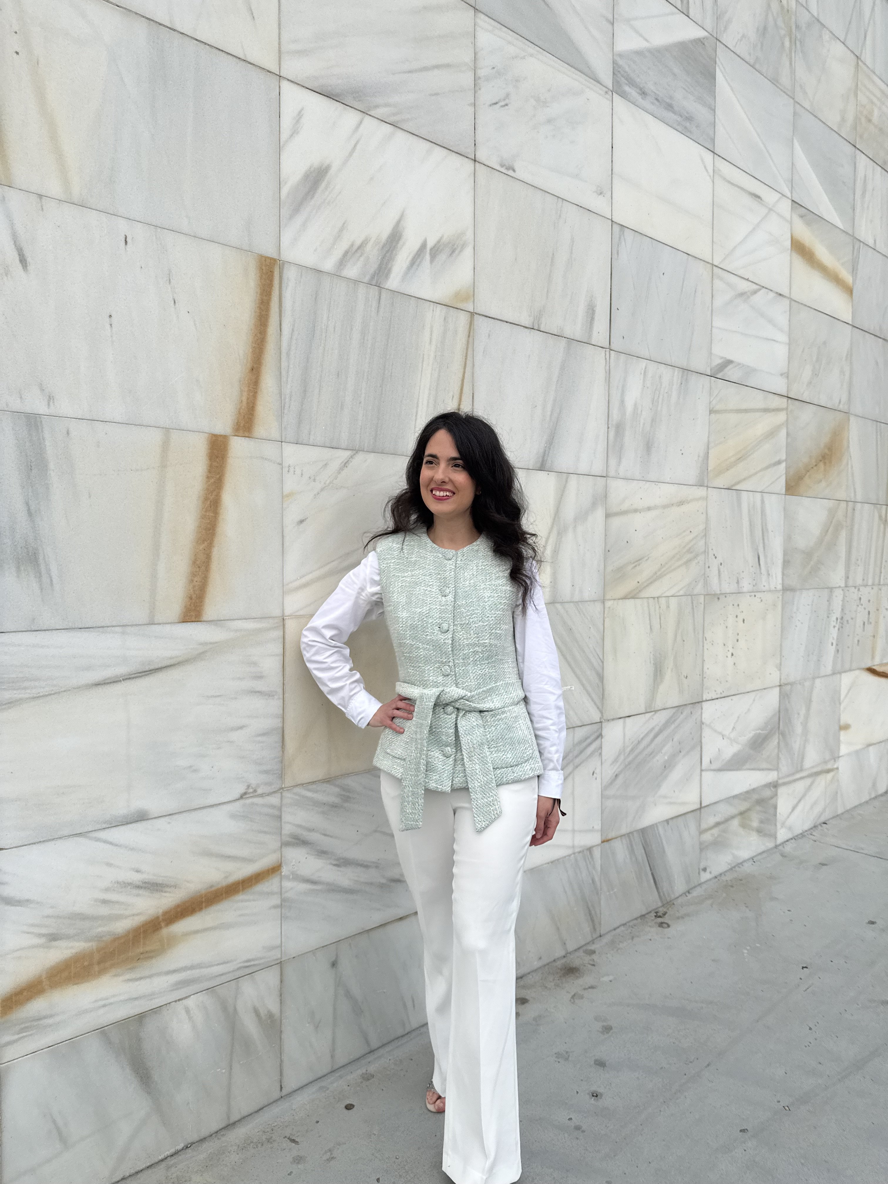 Chaleco de corte clásico y confección impecable, una pieza diseñada para realzar la silueta femenina, en especial de las mujeres petite por su largo ideal y el ajuste en la cintura.