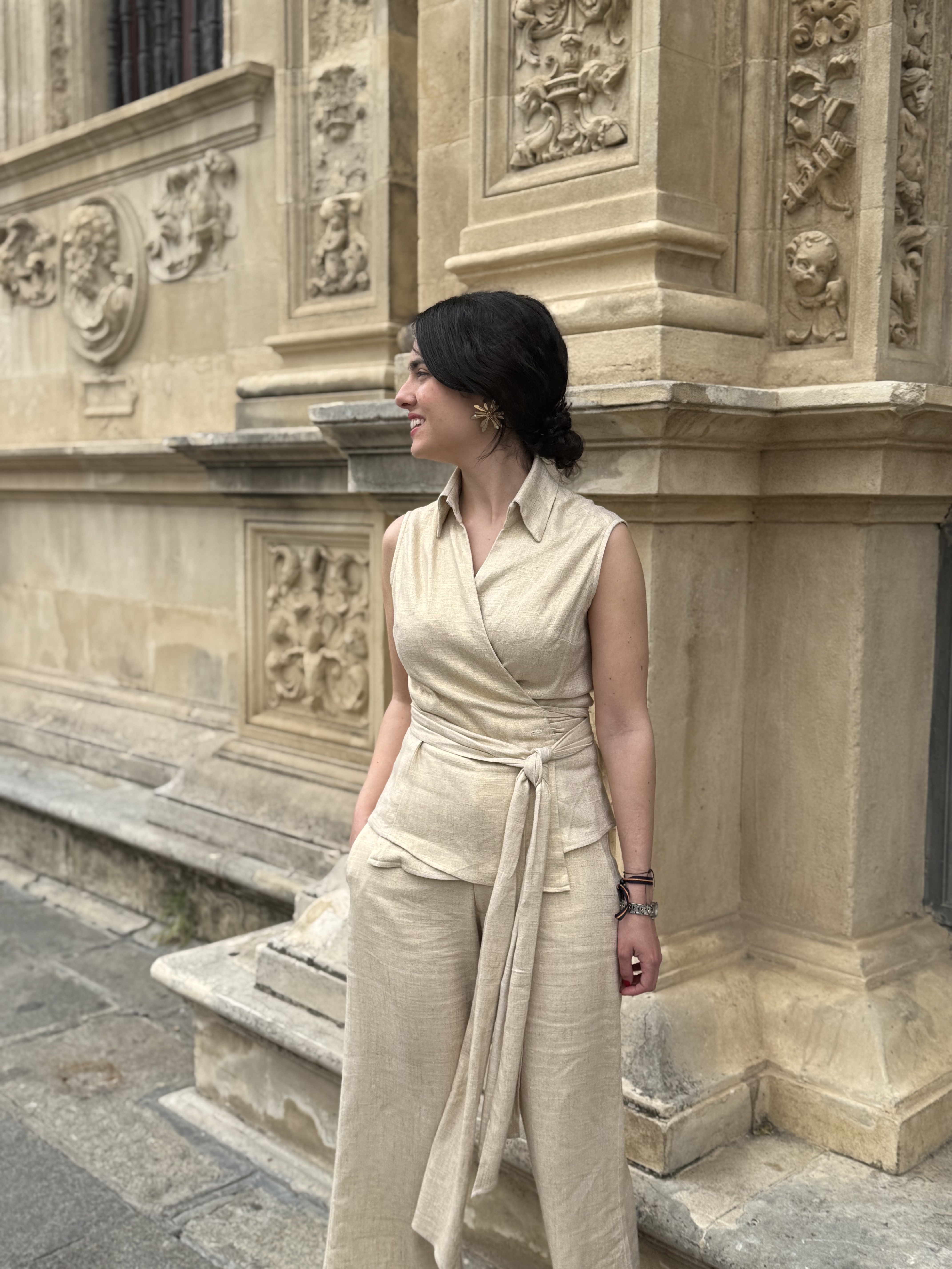 El conjunto de lino más chic para tus días de verano. Ideal por su patrón clásico y atemporal, ya que define la silueta femenina con el largo perfecto para chicas petite.