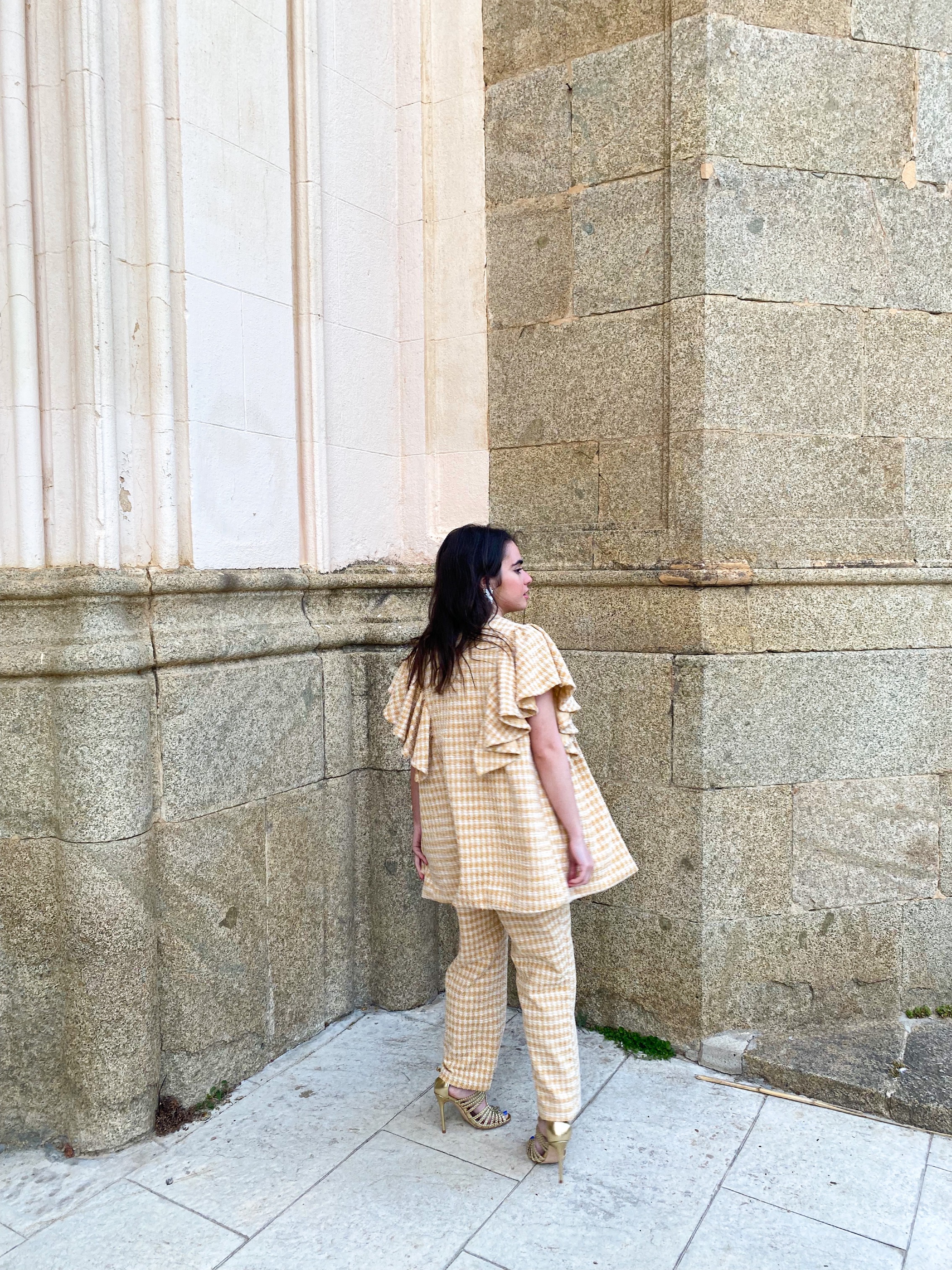 Chaleco tweed con volantes en las mangas, forrado en tejido de algodón orgánico.