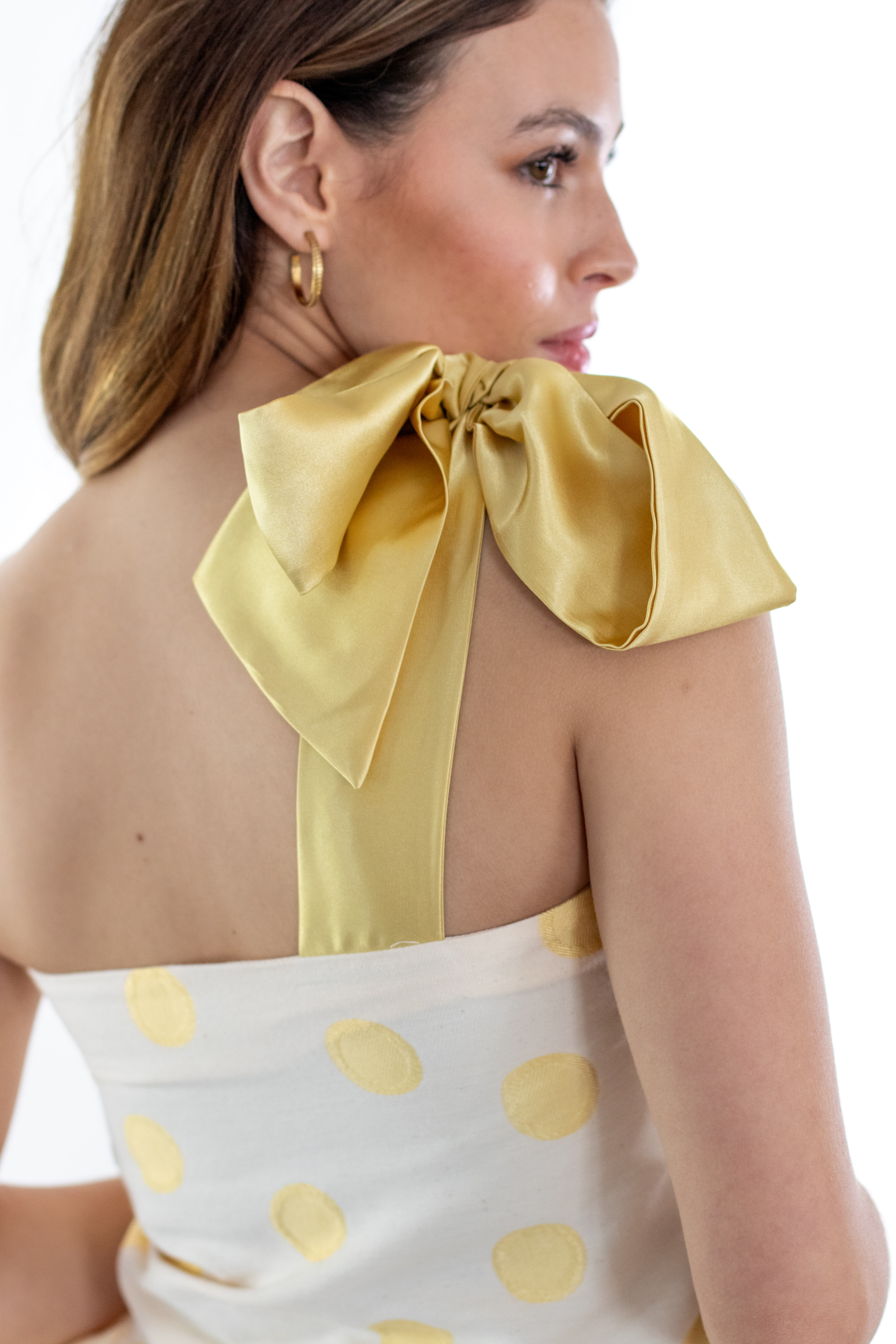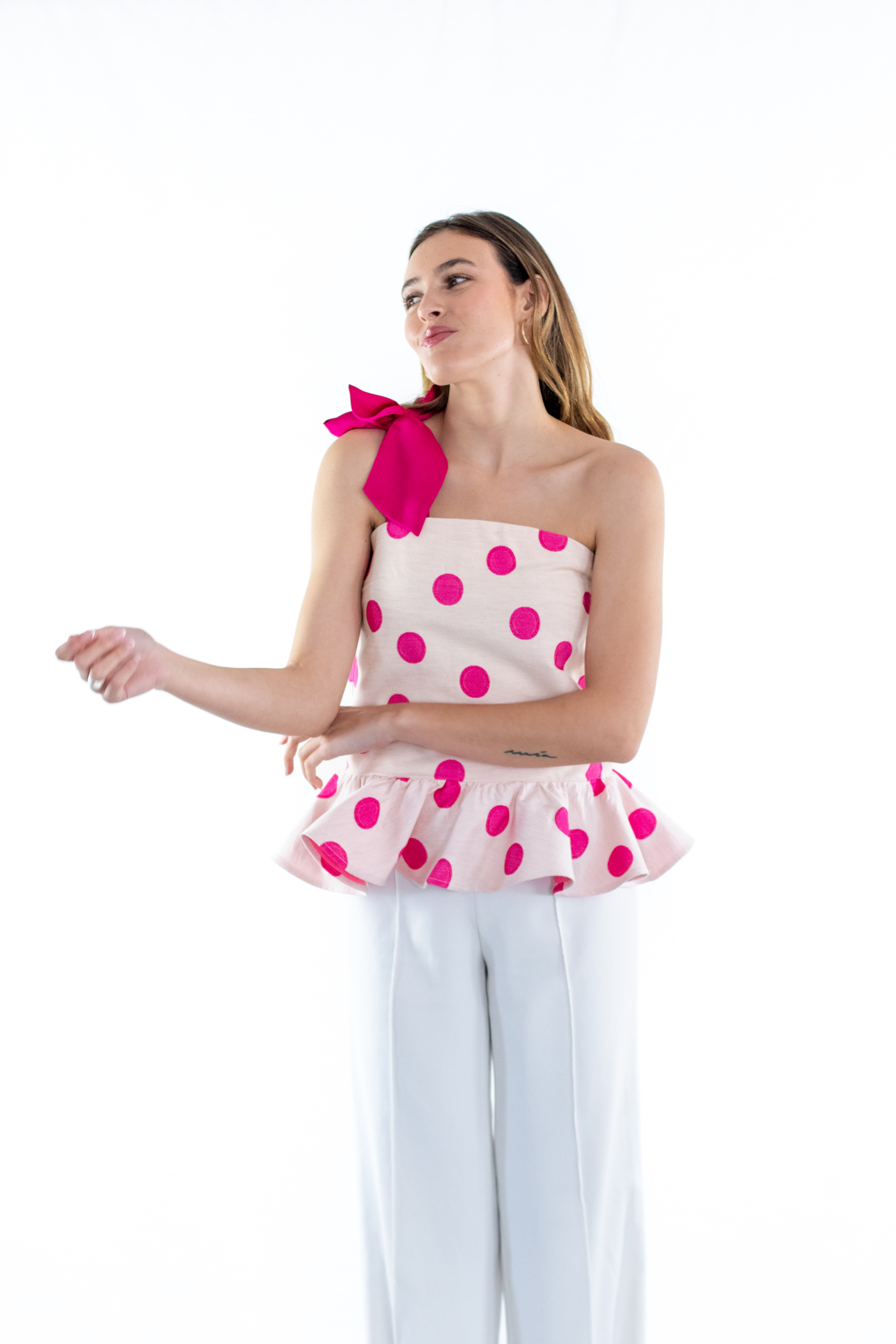Top asimétrico con volante en el bajo en tejido estampado de lunares en 3 tonos distintos.